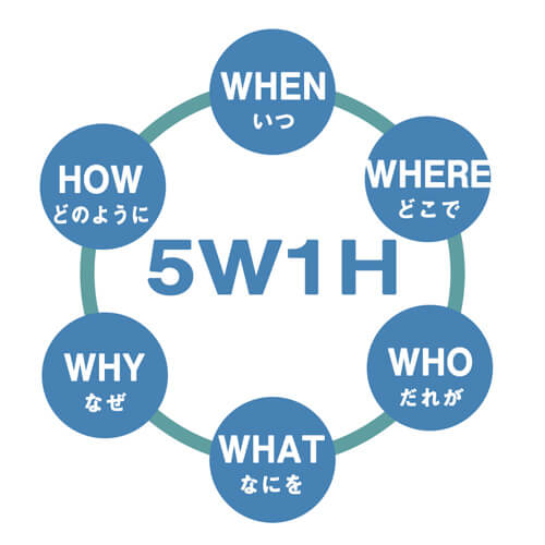 5W1Hは、ビジネス戦略などを作る際に用いられる考え方の一つ。「アイデアが行き詰まった…」という時に使うと、すっきり整理できます。「5W1H」という名称は、6つのキーワードの頭文字をとったものです。