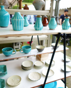 陶芸作家さん主体のイベントということで、展示販売されているのはお皿やカップ、茶わん、茶器、酒器、花器、土鍋など食卓で役立つものがほとんど。