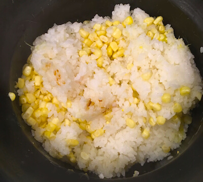 とうもろこしは芯から実を外し、ご飯の上にオン。