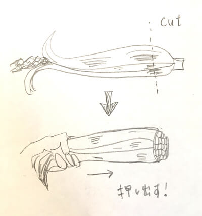 - ⑥ヒゲの方の皮を持ち、実全体を絞り出すようにして取り出す。