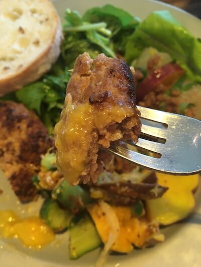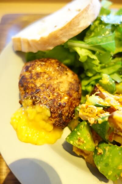 メインディッシュに選んだハンバーグ。口に入れるとジュワッと肉汁があふれて、