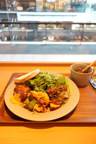 3種類のデリ+サラダ+パン一切れ+スープで、かなりお腹いっぱいに。