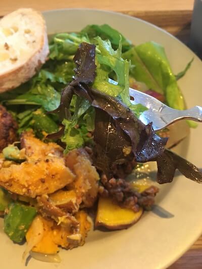 たっぷり盛られたグリーンサラダ、いろんな葉っぱが混じっています。
