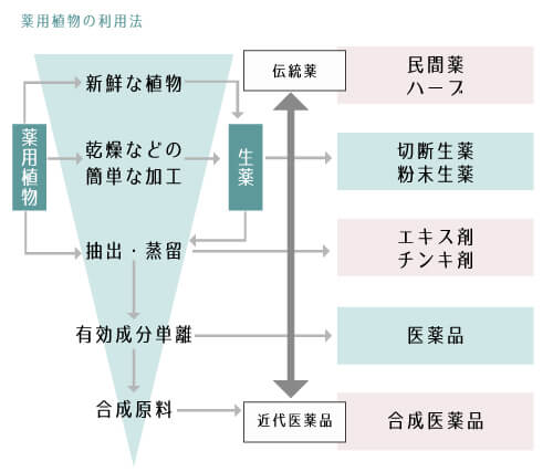 薬用植物を乾燥させたり、粉末にしたものを漢方薬(生薬)として利用します。ドラッグストアで買える一般的な医薬品の中にも、多くの生薬の粉末が配合されています。
