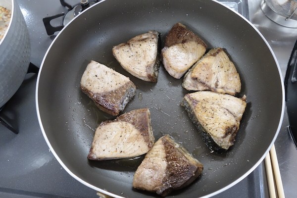 まずぶりをフライパンに立てて焼き始め、皮目をカリッと焼くこと。こうすると皮までおいしくいただけます。