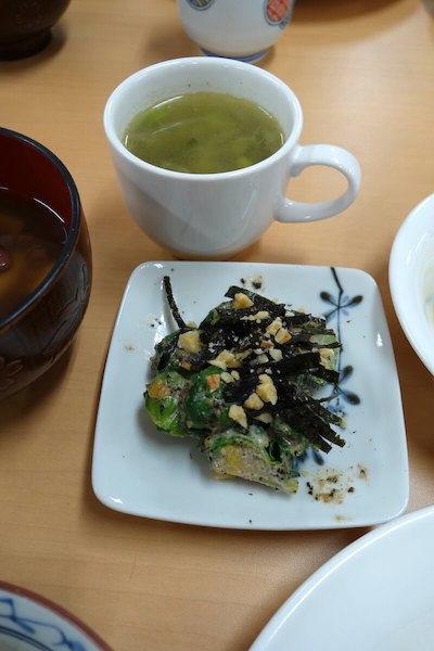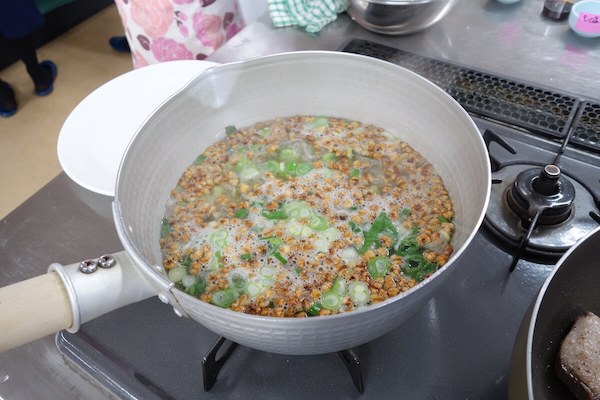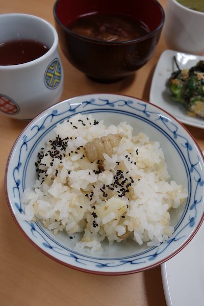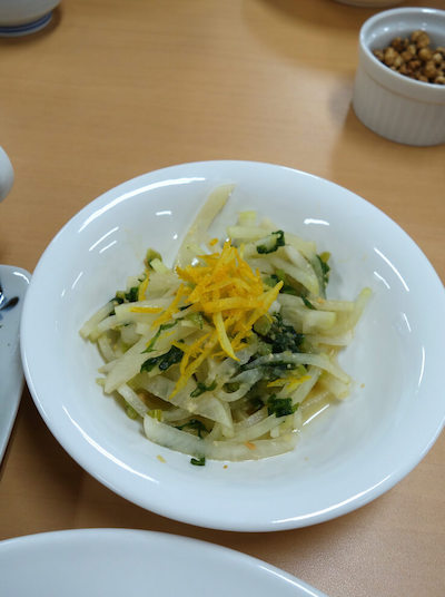 ゆり根とチョロギのごはん。前回の調理実習と同じく、チョロギが登場です。同じ調理グループの60代の方が「昔はゆり根が安くて、一人1個くらいの感覚で食べていて、母が大きな鍋で炊いてたわ。炊くとパッと花が咲いたように広がってねえ」とおっしゃっていました。昔はもっと安かったのでしょうか。とてもおいしいゆり根、私ももっと使ってみたいなと思いました。