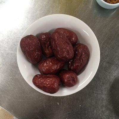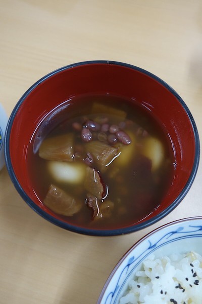 デザートは、大棗(なつめ)と赤小豆(あずき)のぜんざいです。砂糖の加減で、ちょっとだけグループ内でもめました。「これくらいでいい」という人と「私はもっと甘い方が好き」という人が。完全に好みなのですが、大棗には自然の甘みがあるので砂糖を控えめにすることで落ち着きました。