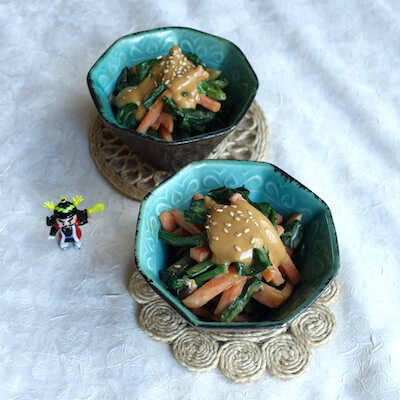 ↑ほうれん草、にんじん、ピーナッツの血を作るレシピ。ピーナツは無添加100%の加工品を使うと便利!