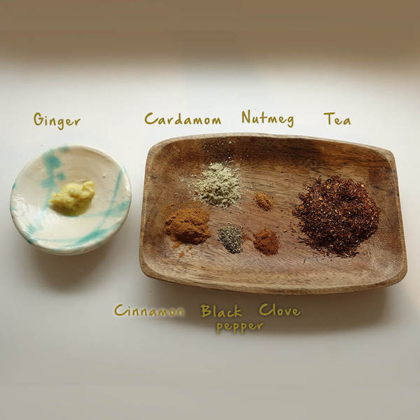スパイスはシナモン、ジンジャー、カルダモンの3つがメインになっています。ジンジャーは生を使うとして、シナモンとカルダモンは必須ですね。