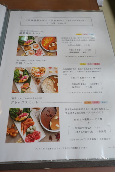 メニューブックには「滋養強壮セット」や「美肌セット」、「デトックスセット」など気になるお鍋がいっぱい!