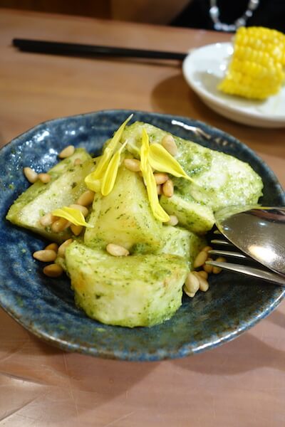 じゃが芋と松の実のバジル和えが運ばれて来ました。ほっこりとしたお芋の食感と甘みが主役。松の実がアクセントになっています。