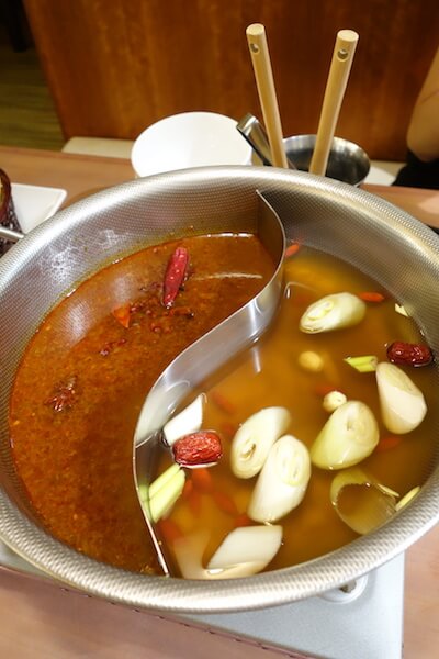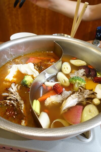 スープは2種類がセットになっています。見るからに辛そうな真っ赤なスープは、烏骨鶏がベース。旨みと辛みのパワースープです。和漢食材がいろいろと浮かんでいる透明のスープは、コラーゲンたっぷりのすっぽんベース。どちらのスープも漢方理論をもとに、さまざまな生薬を煮込んで作られているそうです。