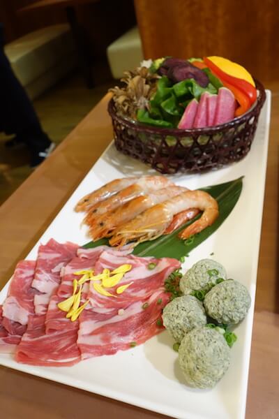 さんざん迷って「ディナー・デトックスセット 3,600円(税別)」をチョイス。とにかくスッキリしたい人にオススメのセットだそうです。具は海老やラム肉、ヨモギ入りのつくねなどがセットされています。
