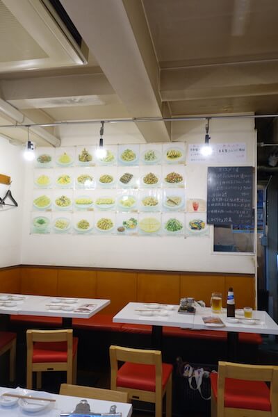 時間が早すぎて貸切状態の店内。壁にはメニューがぎっしり貼られています。