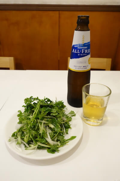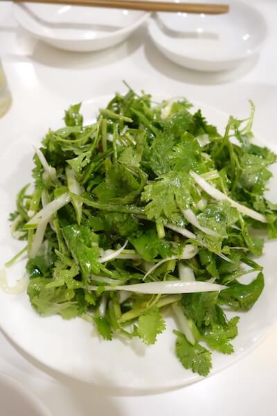 まずやってきたのはこれでもかと盛られたパクチー。「老虎菜(青唐辛子、きゅうり、パクチーのサラダ)」です。