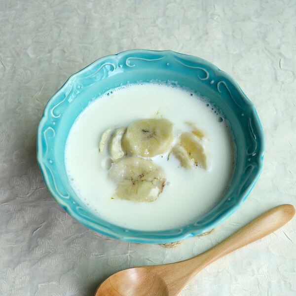 鍋に牛乳を入れ、輪切りにしたバナナを10分ほど煮て、はちみつをかけて出来上がり。バナナが熱を取り、牛乳が肺を潤します。