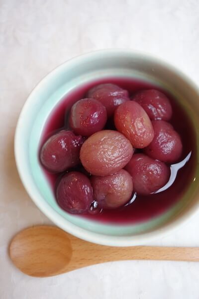 旬のぶどうは血の不足にぴったり。赤ワインでコンポートすると、フルーティでとってもおいしくて感動!巨峰は湯せんして皮をむき、赤ワイン、水、はちみつ、砂糖、レモン汁を入れた鍋で色がつくまで煮ます。そのまま冷まして味をなじませてからいただきます。赤ワインがない場合は、むいた皮と一緒に煮るとワイン色が出ます。