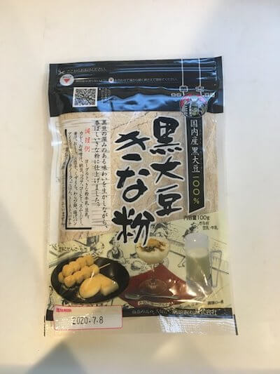ごまの割合が少ない場合があるので、「追いごま」をしてもいいですね。写真は黒大豆のきな粉で、スーパーなどにも売られています。