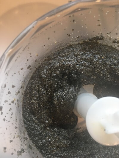 - ①すり炒りごま(黒)、松の実、くるみを2:1:1の割合でフードプロセッサーにかける。