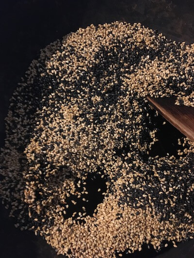 - ②ごまを入れ、混ぜながら焦げないように炒る。