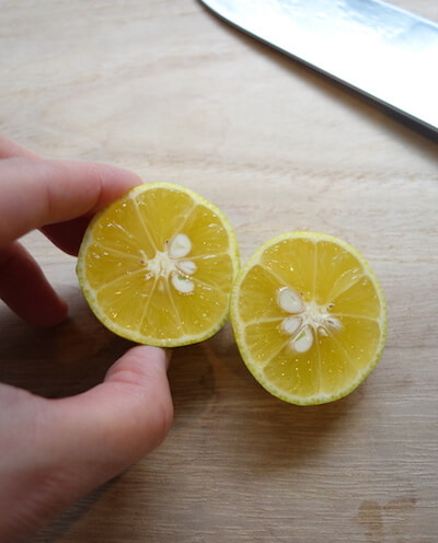 みかんの皮は手でむき、ヘタを取っておきます。すだちやゆずの場合、半分に切ってタネをのぞき、実と皮に分けます。