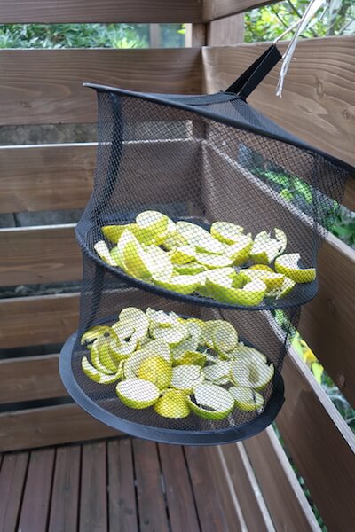 皮が重なったり、雨に当たったりするとカビの原因になるのでご注意!一週間ほど干し、水分が抜けてカリカリになったら完成です。
