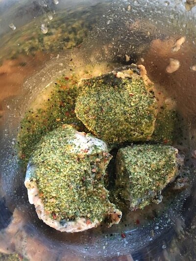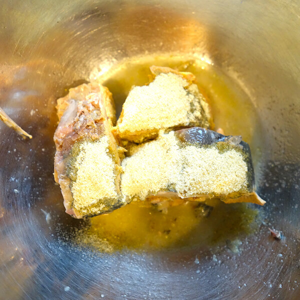 まずはさば缶にレモンハーブのスパイスをふりかけます。