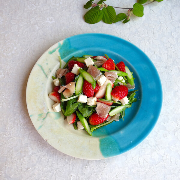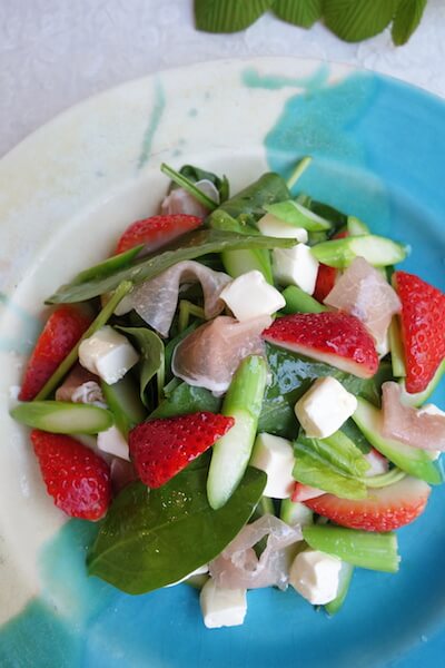 それなら、サラダにも合うんじゃない?と、あえて野菜扱いしてみることに。いちごのほかに、サラダほうれんそう、生ハム(豚肉)、クリームチーズ、アスパラガスの具材をチョイス。薬膳的には、潤いを補って血を作る組み合わせです。