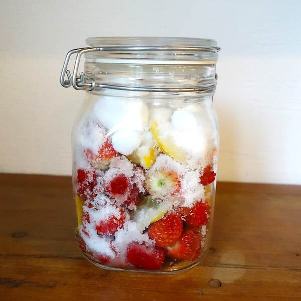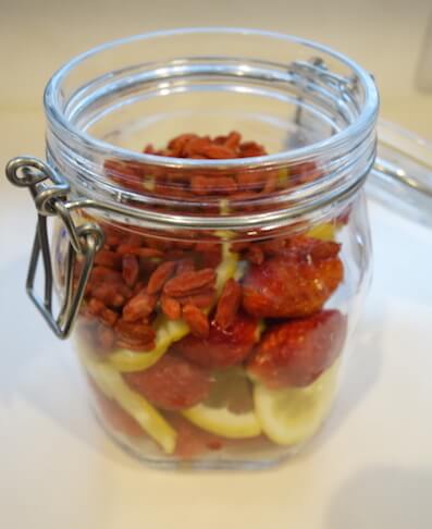 • ③消毒したビンに①、②、砂糖、クコの実を入れる。