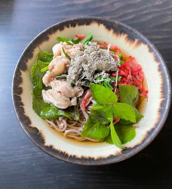 冷たいそばはもたれるので、薬味たっぷりのあったかいおそばにしました。にら、みつば、しそ、干しエビ、鶏肉と、これでもか!と体をあたためるものをトッピング(笑)。とろろ昆布はうまみ役+余分な水の排出を助けます。