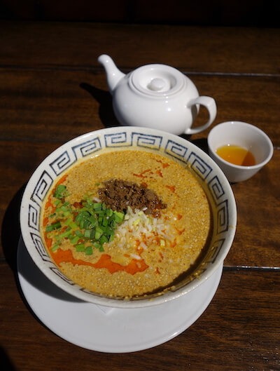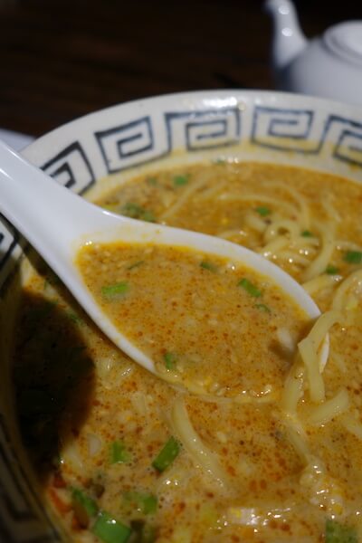 注文した白胡麻坦々麺が運ばれてきました!見た目からして、とっても辛そう。白濁したスープは、辛いけれども濃厚な旨みがあふれるのでついつい飲んでしまうおいしさ。白胡麻がプチプチしてアクセントになっています。