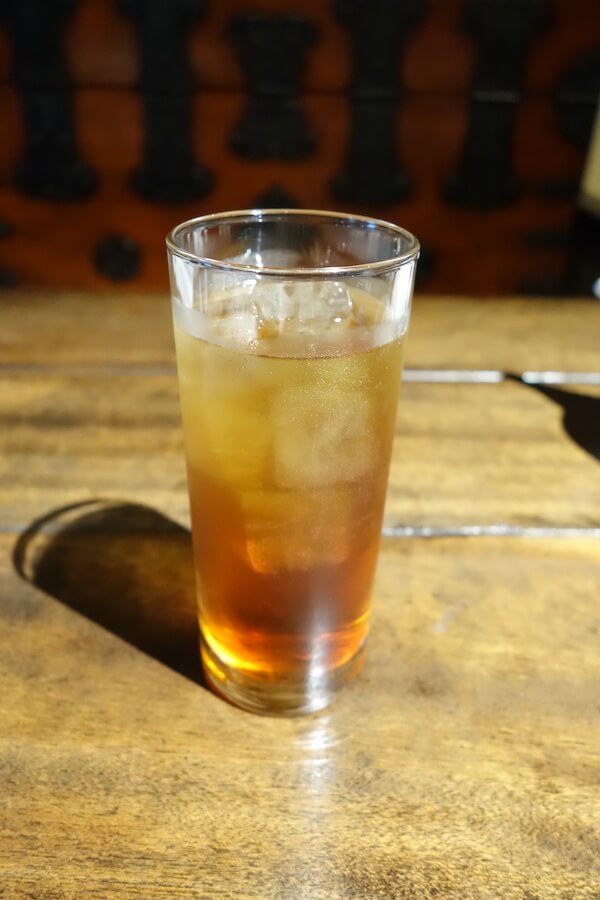 酸梅湯が運ばれてきました。あれ、赤くない。酸梅湯といえば赤というイメージがあったのですが、茶色。っていうか、見た目は「冷たい麦茶」です(笑)。