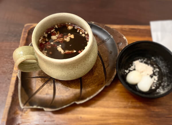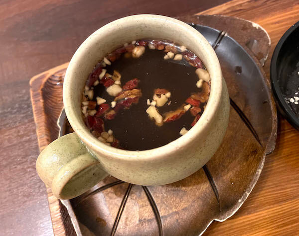 オーダーした「宮廷韓茶」は一見苦そうなのですが、甘くてコクがあり、意外と飲みやすい!なつめや松の実が浮かんでいて、食感も楽しい1杯です。
