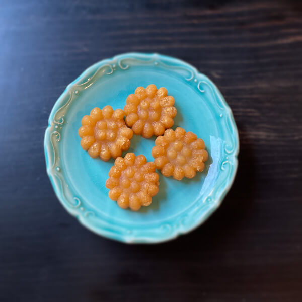 小麦粉、はちみつ、ごま油、酒などを練って、油で揚げてから、はちみつとしょうが汁を合わせた中に漬け込みます。けっこうヘヴィ系のお菓子なのですが、むっちり&しっとりした食感と甘めの味わいにハマる!昔、はちみつを薬としたことから、薬菓と呼ばれているそうです。