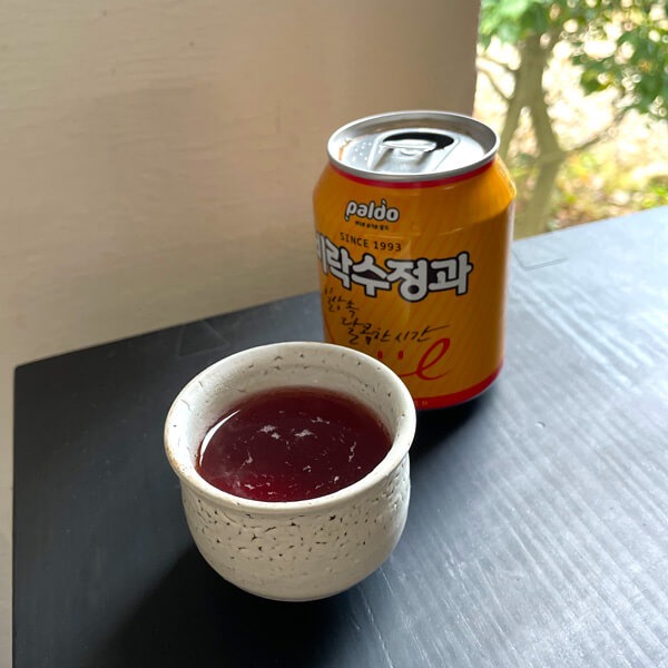 ただの缶入りジュースに見えますが、これも立派な伝統茶のひとつ。水正果(スジョンガ)といい、ショウガと桂皮、干し柿を加えた、甘〜いお茶です。韓国では冬の寒い時期、暖かい部屋で冷やしたスジョンガを楽しむとか!