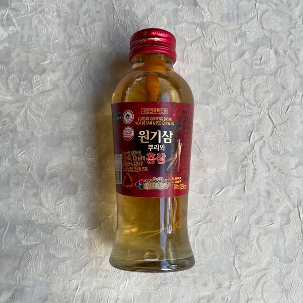 見た目からして漢方な感じがする健康栄養ドリンク「KOREAN GINSENG DRINK」。ビンの中に高麗人参(紅参こうじん)が丸々一本入っていて、びっくり!