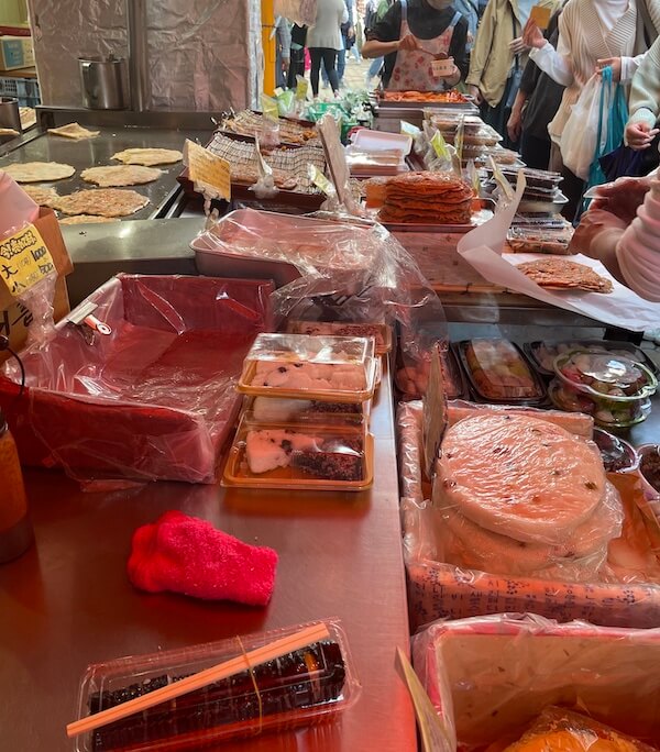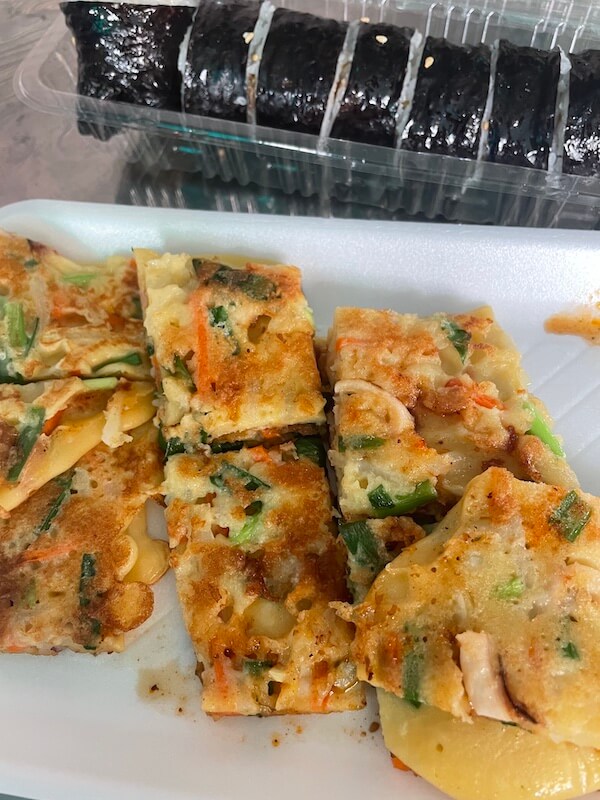 店先でチヂミを焼いている昔ながらのお惣菜屋さん!行列ができていたので、キンパとチヂミとトッポッキを買ってその場で食べてみました。
