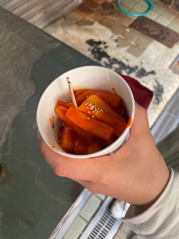 トッポッキは真っ赤なコチュジャンソースをからめた細長いお餅。韓国には数回行ったことがありますが、トッポッキは今回初体験。甘辛いソースにもちもちのお餅のハーモニーがとってもおいしかった♪ちなみに、日本人に人気の韓国B級グルメの人気1位がキンパ、8位チヂミ、10位トッポッキだそうです!(韓国観光公社さん情報)