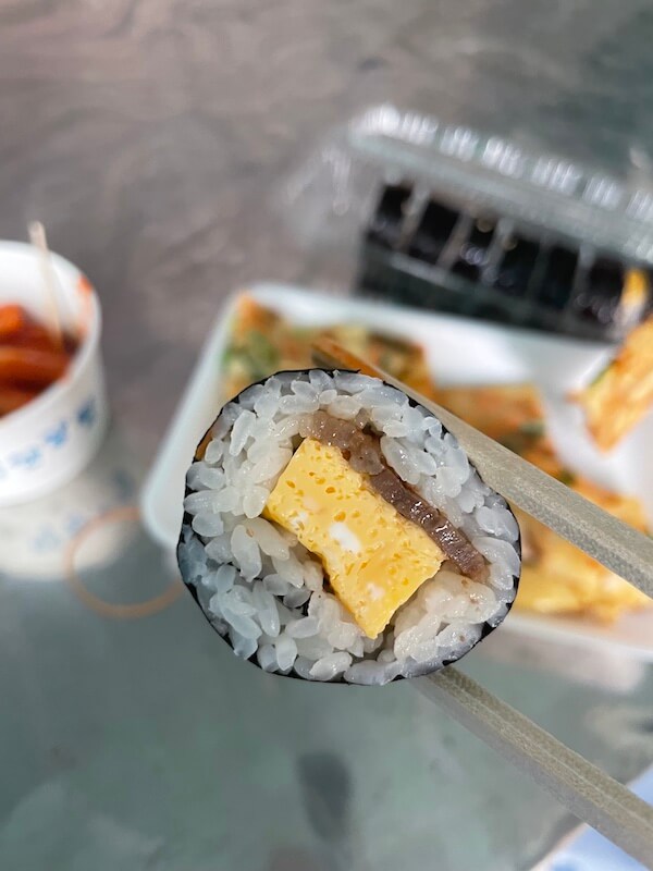 日本の海苔巻きに見えるキンパ。酢飯は使っていないのでお寿司とはまた違った味わい。具も海鮮やチーズなど、お店によっていろんな味があるんだとか!