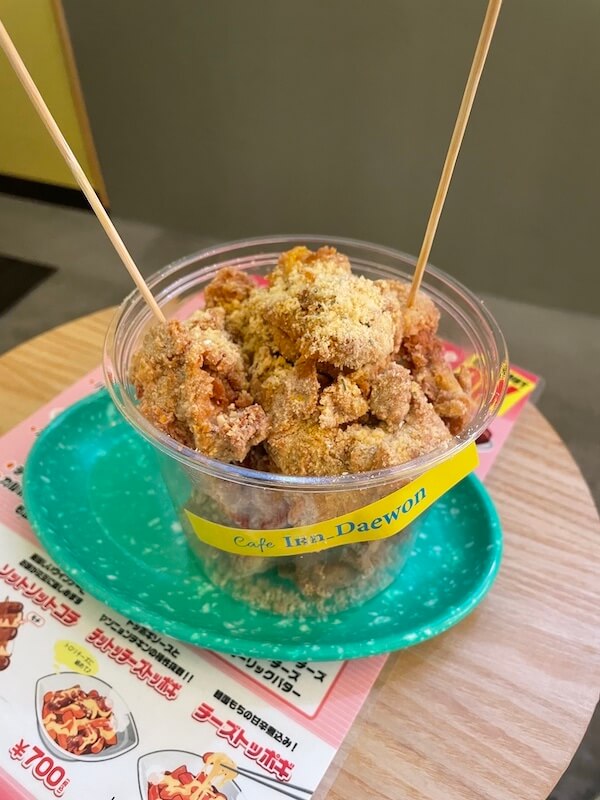 辛いヤンニョム味ではなくて、あえてハニーバター味をチョイス。甘いのにバターが効いて、すごいボリュームで二人でも食べられませんでした…。ビニール袋をもらって持ち帰りできるので大丈夫!