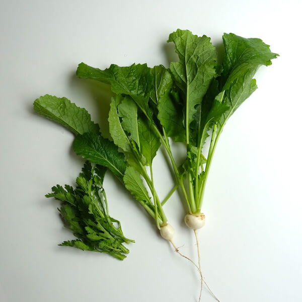 おかゆで体をいたわるを目的なら、七草にこだわらず、大根の葉・かぶの葉・水菜・ほうれん草・青梗菜・小松菜・春菊など、身近な青菜を使ったおかゆでOK!我が家も、庭のかぶと春菊だけで作りました。