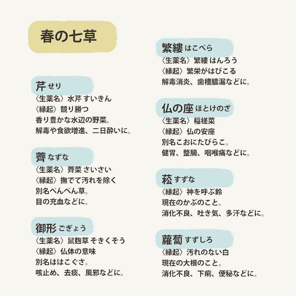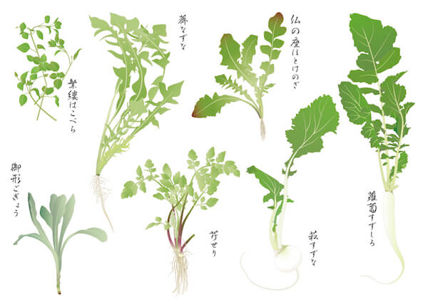 1/7は人日の節句。この日の朝に食べるのが「春の七草がゆ」です。お正月のごちそうで疲れた胃腸をいたわる意味と、七草の生命力の強さにあやかる意味が込められています。