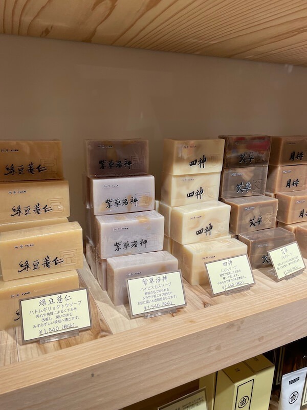 生薬やハーブを使った石けんのラインナップ。ヨモギや洛神花(ハイビスカス)など、薬膳人なら気になるものが使われているのがポイントです。