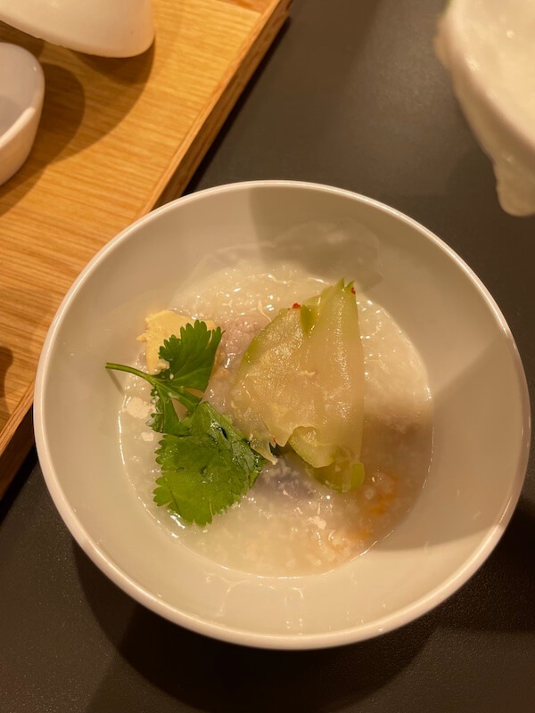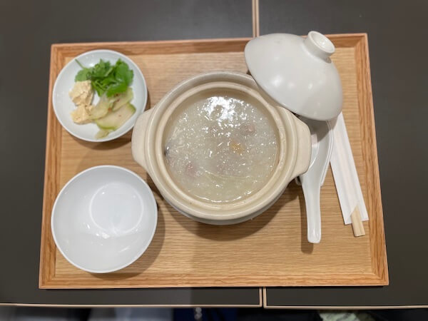 まずは豚肉と筍のおかゆ。おかゆはとろ〜り、まるでポタージュのような食感。しっかり食べ応えのある豚肉が入っています。干しエビの旨味がふわっと広がるのがポイント!
