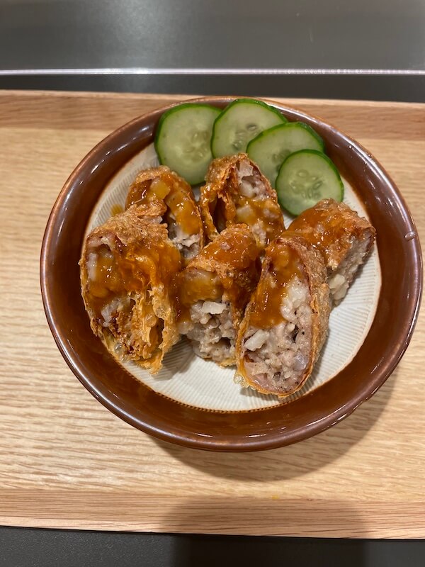 台湾式豚肉入り湯葉巻き。湯葉でミンチを包んだものをカラッと揚げてあり、サクッとした食感の中から旨みがジュワ〜ッ。ミンチにも具材が入っていて、食べ応えがあります。