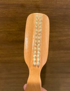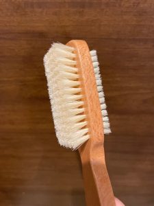 こちら、野菜専用ブラシです。今まで私はふつうのタワシを野菜用に使っていたので「これはいい!」と思わず購入。両面に毛がついていて、持ち手もついているのが便利。片面はモヒカン状態なので細かいところにもフィットします。