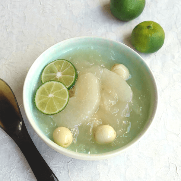 白きくらげと梨の相乗効果で肺を潤して、肌の乾燥、シワ、空咳などに効果的。蓮の実、すだちは潤いを閉じ込める役割です。