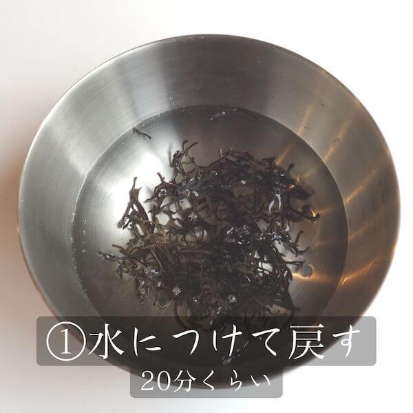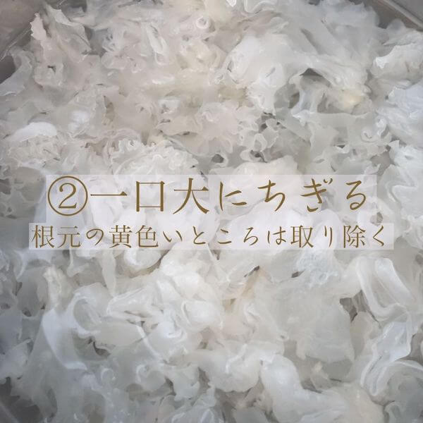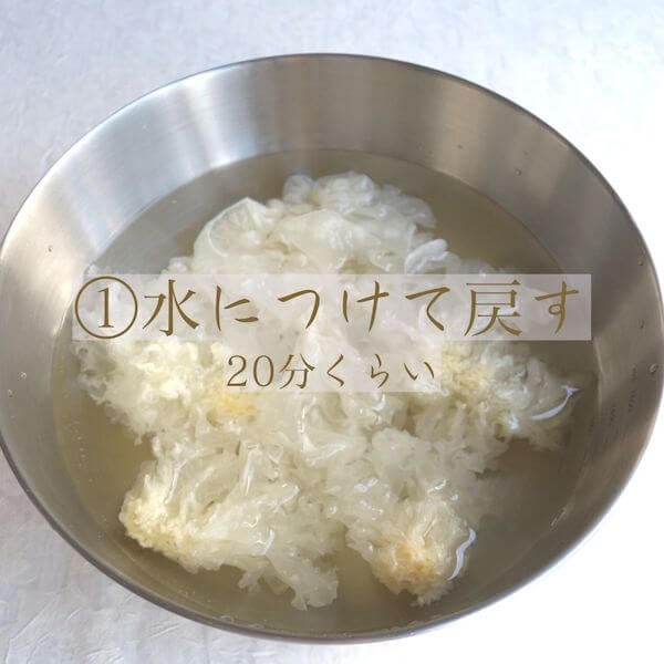 白きくらげはたっぷりの水に20分ほどつけて戻します。