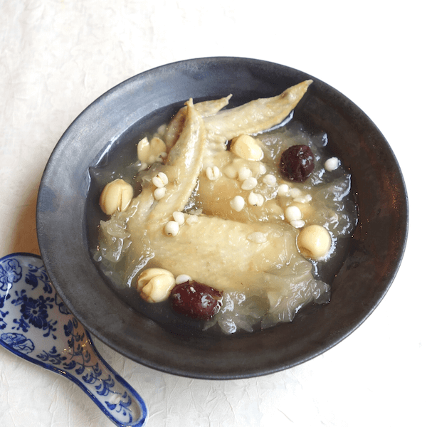 白きくらげはとろみがあるので煮物やスープなどにも抜群に合います。鶏手羽先と煮込んだスープは、体を内側から潤して肌に良いほか、めまいや耳鳴り、関節の動き、更年期の症状にも合うスープです。