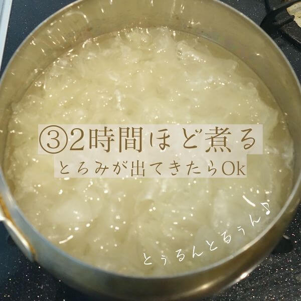 たっぷりの水ときくらげを入れて火にかけ、沸騰したら弱火にし、とろみが出てくるまで2時間ほど煮ます。なかなかとろ〜んとしないのですが、ある時点を超えると急にとろ〜んとしてきます。(圧力鍋を使うと時短で仕上がります)